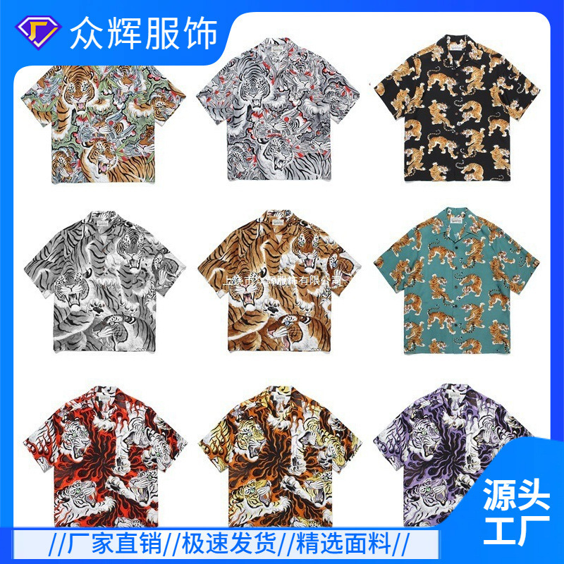 GUILTYPARTIES TIGER 23SS TIM LEHI flame TIGER full printed Hawaiian short sleeve shirt for menForeign trade men's casual short sleeve 3D printed flame shirt European and American personality men's wish Amazon hot men's clothing