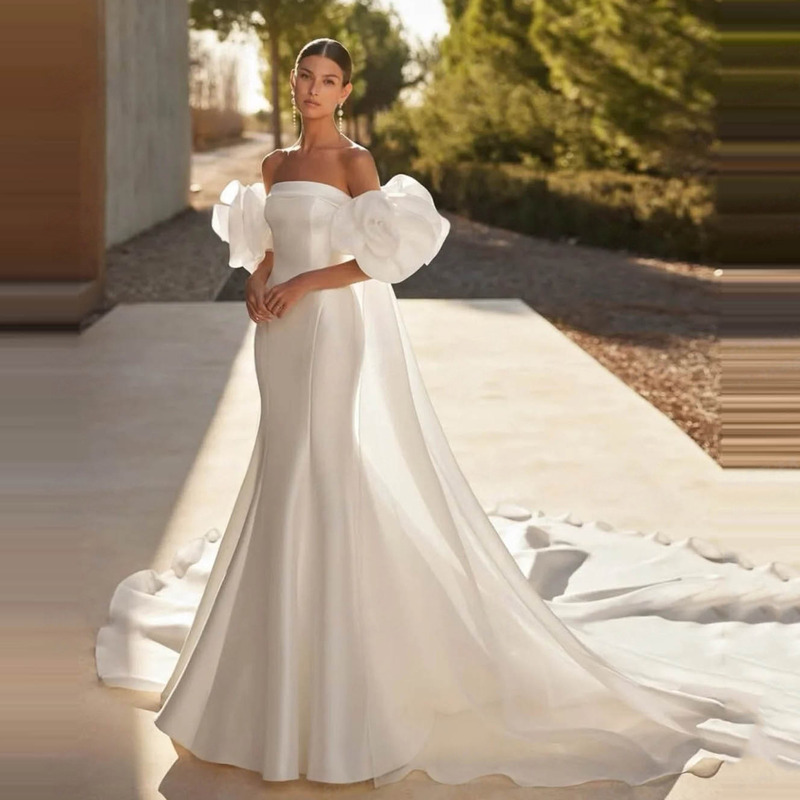 Cross-border Foreign Trade Bag Shoulder Slim Two-piece Lace Wedding Dress Satin Rear Split Personality Travel Light Wedding Dress2026 New Style Floor-Length High-Waisted Strapless Wedding Dress, Red Banquet Evening Dress with Small Shawl Two-Piece Set